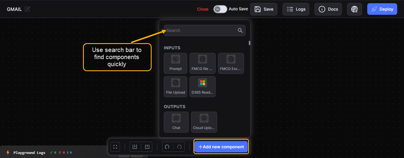 + Add new component (blue button) – Add tools, agents, data, models, inputs, outputs.