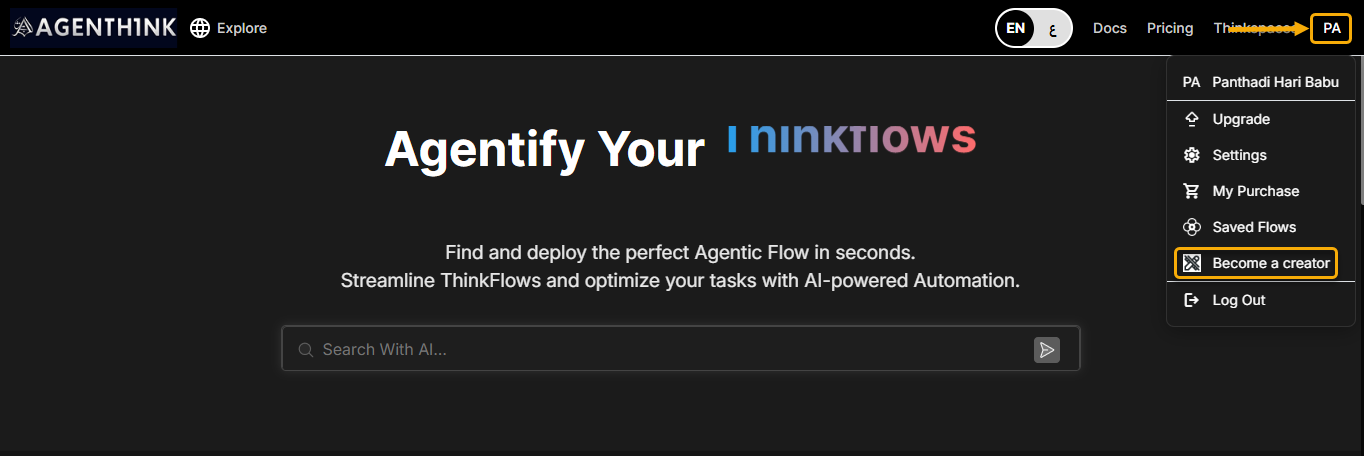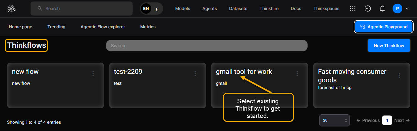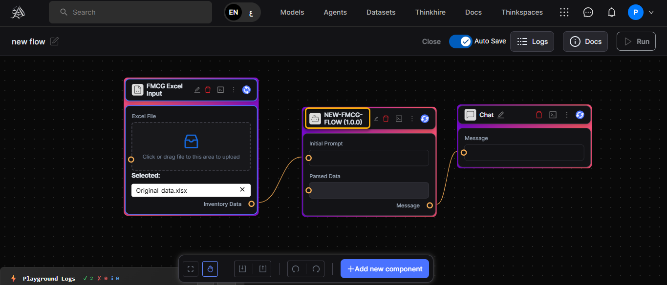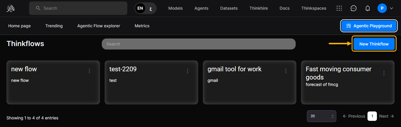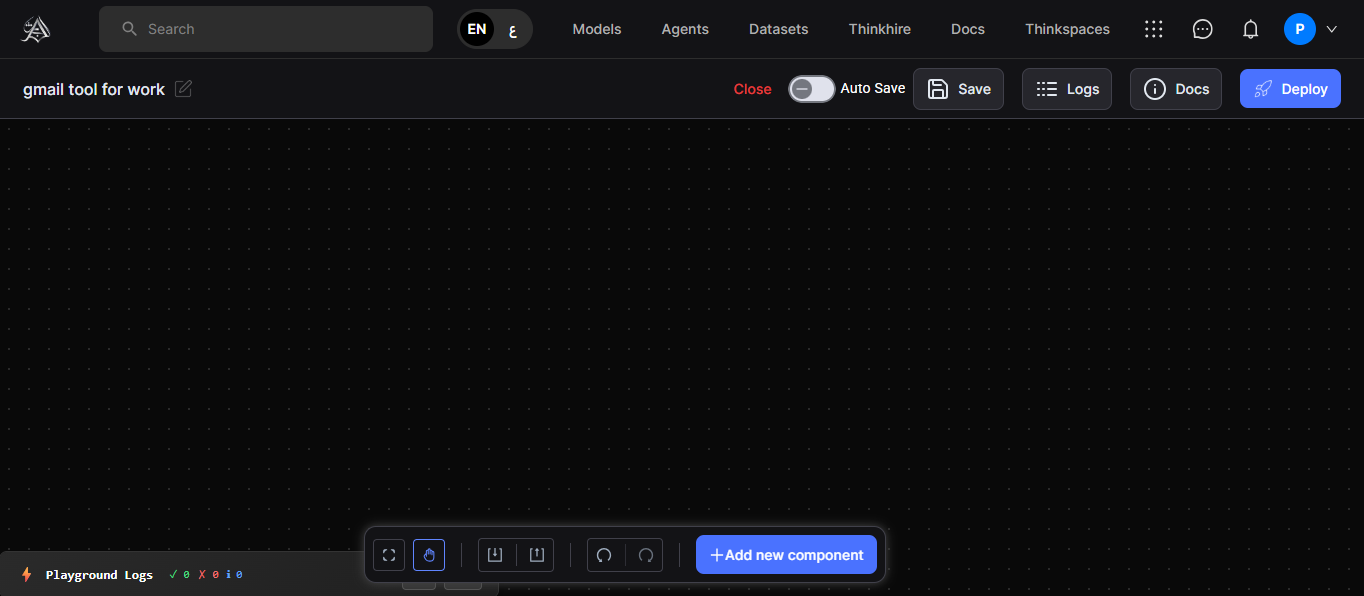 The AgenThink AI platform features a no-code visual development environment called the Agentic Playground. Use the Playground to design, build, and run intelligent Thinkflows powered by large language models (LLMs).