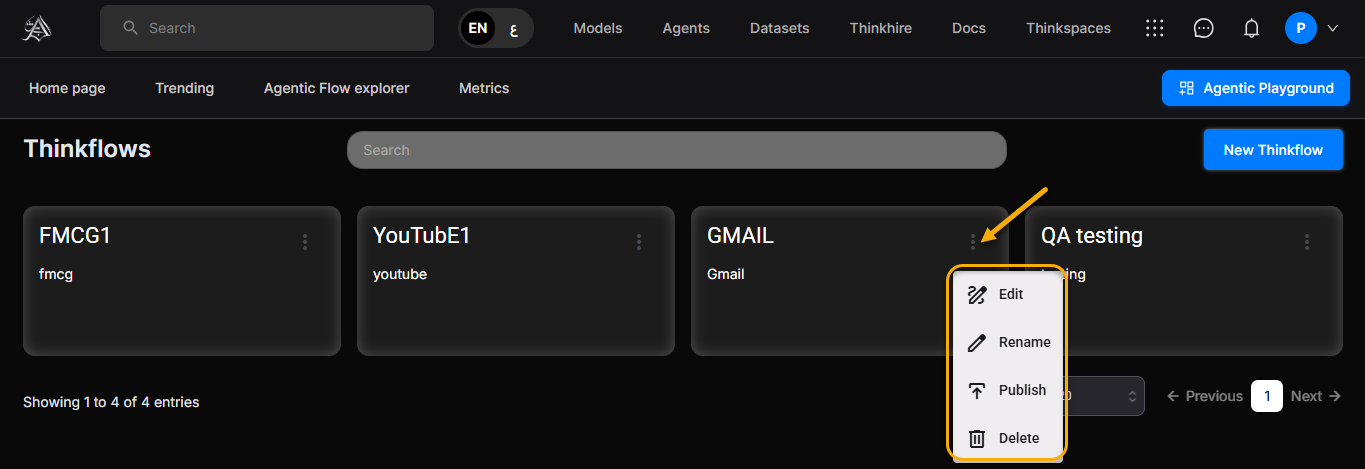 - From the home page, you can Rename, Edit, Publish, or Delete a Thinkflow.