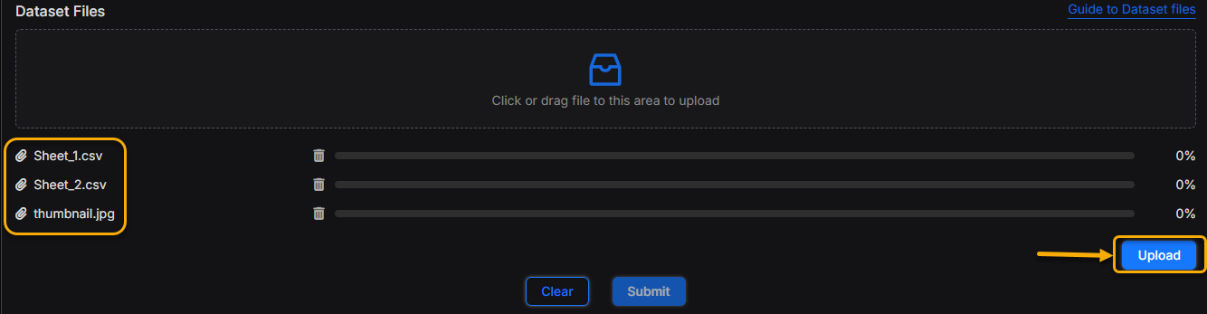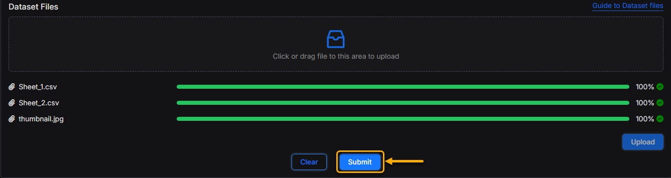 Note: A link to Guide to Dataset Files is a available beside the upload section.