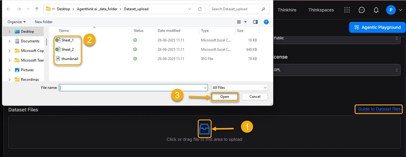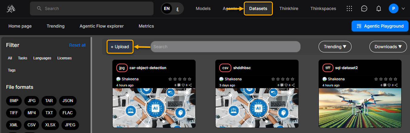 Datasets are structured collections of data used to support AI tasks such as Natural Language Processing, Computer Vision, and Audio Analysis. In AgenThink, creators can upload, manage, and share datasets through the Datasets Library. These datasets are critical building blocks used in Thinkflows, where they work in combination with Models and Agents.